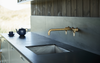 Til køkkenet i det store, åbne leverum og til husets badeværelser, der er holdt i rolige brun- og gråtoner, valgte arkitekten SP-greb, der er let genkendeligt ved sit enkle formsprog. Hvorfor? “Det har jeg lært hjemmefra,” forklarer Schülein, der er selv er vokset op med det tidløse armaturdesign og siden har brugt det i en del af sine projekter. Materialet er altid ubehandlet messing, som patinerer nænsomt over tid. “De er praktiske. Du skal faktisk ikke tænke på at pleje dem. De bliver bare pænere ved brug”, lyder der fra arkitekten.