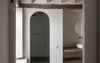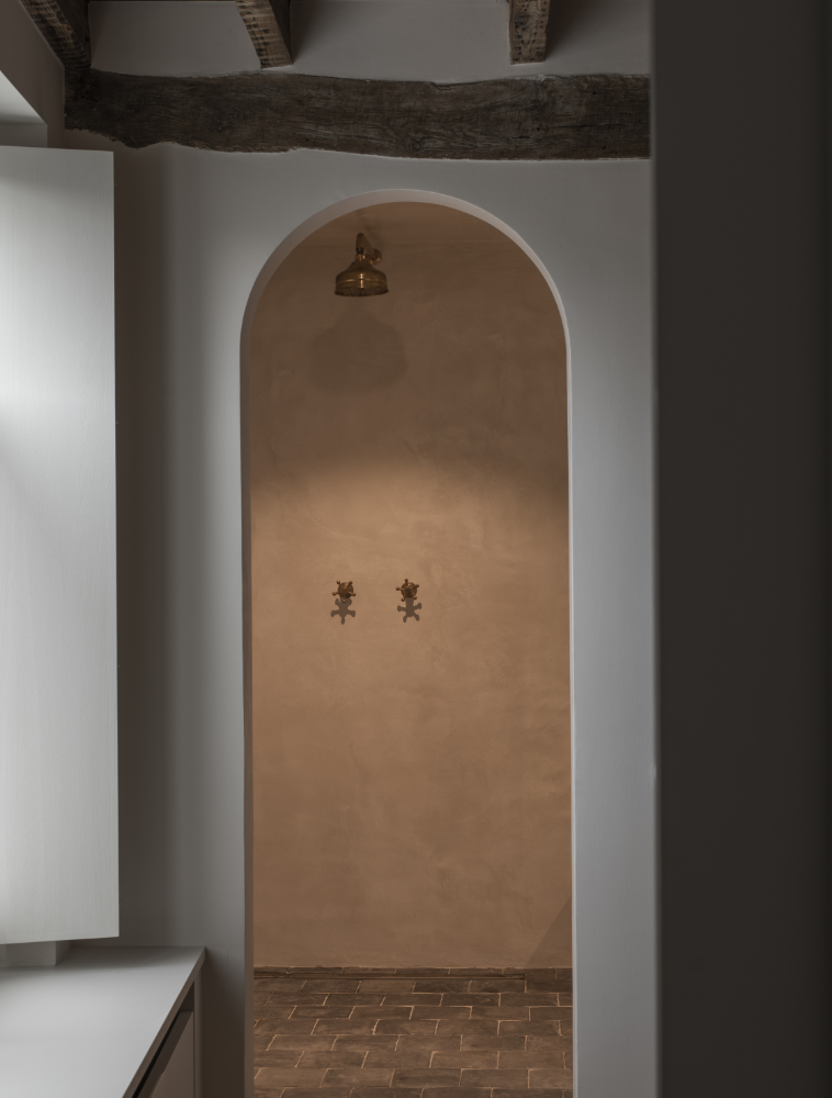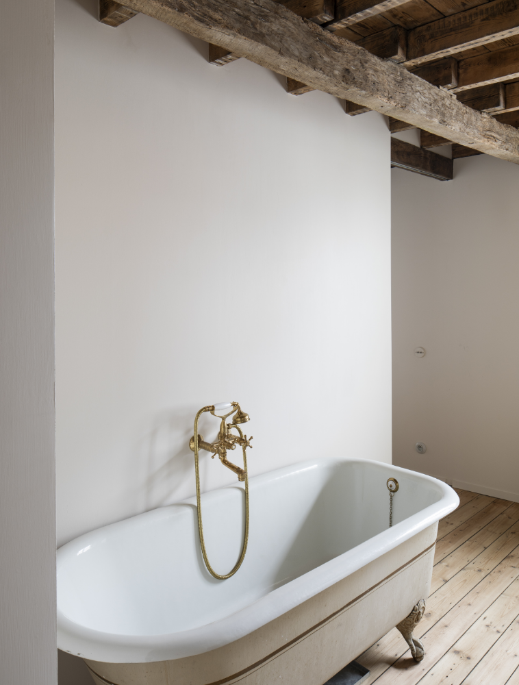 Under rustikke træbomme, ligger badeværelset i ledtog med soveværelse og garderobe. Det antikke stålbadekar var oprindeligt en del af huset, men er i renoveringen blevet rykket fra første til anden sal. Det tunge badekar hviler på solide løvefødder i massiv messing, som går igen i det væghængte Christiansborg-armatur, der udover dets funktion bidrager til rummets sans for gammelt håndværk.