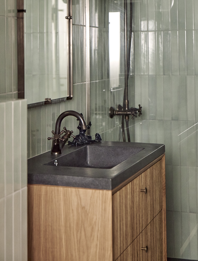 På badeværelset er gæsterne omgivet af håndmalede fliser, der lyser rummet op i en beroligende, grøn tone, som danner en elegant kontrast til det snedkererede badeværelsesmøbel, lampeklassikere og Christiansborg-armaturet, der pryder både håndvasken og bruseren på badeværelset i en bruneret overflade.